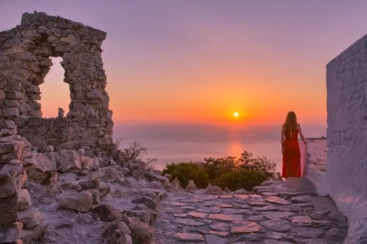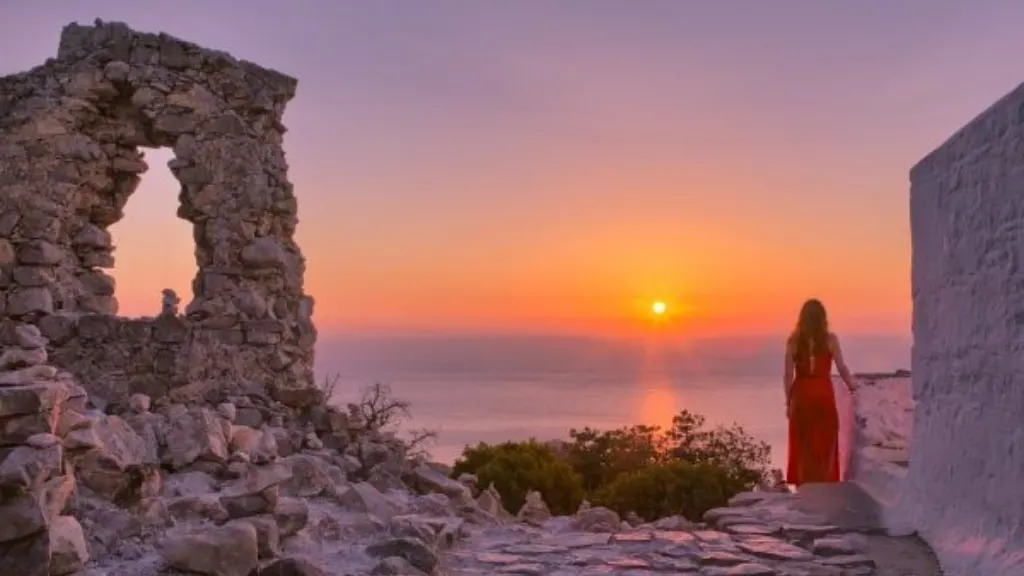The Castle of Monolithos is widely ruined today but it offers great views of the sea and the two islets opposite to it. Inside the Castle, there is a small working chapel dedicated to Agios Panteleimon (Saint Pantaleon). Access to the castle is by a staircase cut into the rock. The steps, whilst not particularly steep, are quite slippery simply due to the numbers of visitors wearing them away. On the climb up to the top, you are likely to see hundreds, if not thousands, of small piles of rocks from 3–10 in number. These piles are left there by the visitors as a form of a memento.