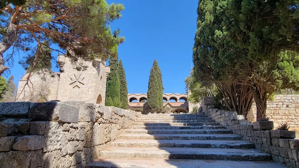 Το μοναστήρι των ιπποτικών χρόνων που καταλαμβάνει μεγάλο τμήμα του πλατώματος στην κορυφή του λόφου έχει ως πυρήνα μικρό ναό αφιερωμένο στην Παναγία στον οποίο αναγνωρίζονται τρεις οικοδομικές φάσεις. Η πρώτη ανάγεται στο α΄ μισό του 14ου αι. και αφορά στην ανέγερση ενός μονόχωρου σταυροθολιακού κτίσματος οικοδομημένου στο ανατολικό τμήμα του βόρειου κλίτους της βασιλικής. Στην επόμενη φάση που τοποθετείται γύρω στο 1450-1480, εντάσσεται η προσθήκη δύο εξάπλευρων παρεκκλησίων σε επαφή με την κόγχη του αρχικού ναού, ενώ στην τελευταία, επί μαγιστρείας Pierre d’ Aubusson (1423 – 1503), η προσθήκη δύο ακόμη παρεκκλησίων ανατολικά των προηγούμενων και σε επαφή μαζί τους.